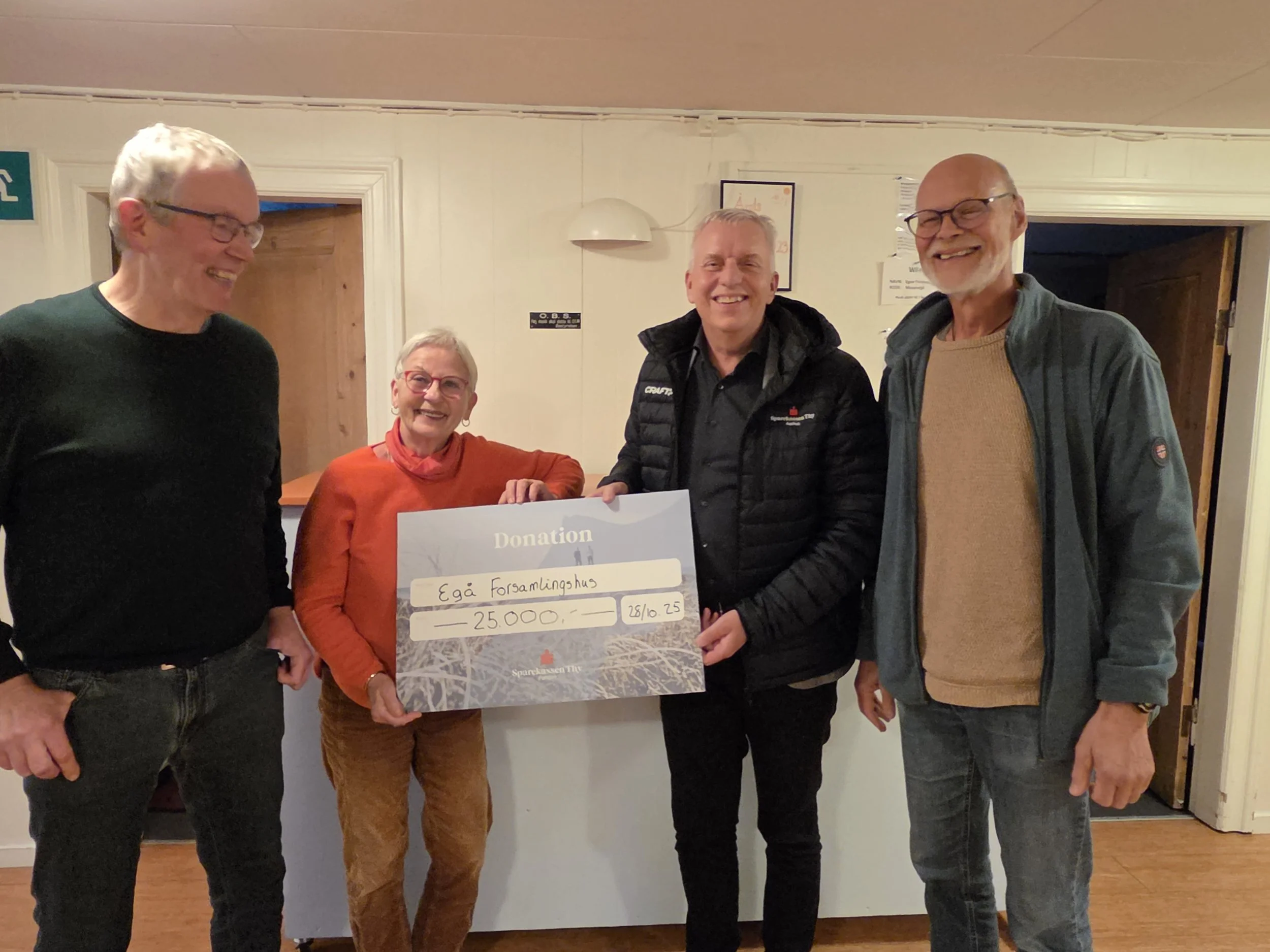 Forleden var direktør for Sparekassen Thy i Aarhus, Bo Dall-Hansen, forbi forsamlingshuset for at overrække beløbet til styregruppen for projektet: